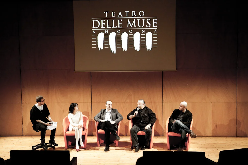 Left to Right: Journalist Filippo Brunamonti (The Huffington Post, La Repubblica) interviewing Coralina Cataldi-Tassoni, film director Mariano Baino, Special FX artist Sergio Stivaletti and Journalist Luca Barnabè for the launch of the USA & European book tour of Coralina:Life is Art/Art is Life; at the Teatro delle Muse, Ancona, Italy. (photo M. Santini)